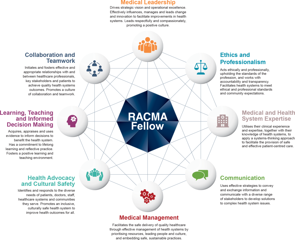 RACMA Fellows integrate the competencies from all 8 interrelated and intersecting domains of professional practice. For each of the domains of professional practice the expected graduate outcomes, key competencies and learning outcomes are defined. Together these describe the attributes expected of a Candidate upon completion of the RACMA Fellowship Training Program.